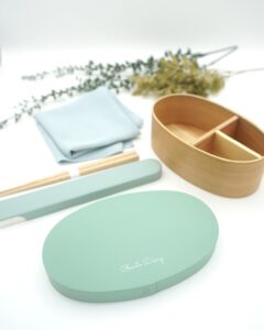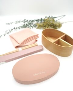 曲げわっぱだけでなく、その周辺カトラリーでランチタイムをトータルコーディネート。パステルカラーの箸箱は樹脂製で、メンテナンスのしやすいアイテムです。カラーコーディネートした風呂敷は、古くから着物や小物にも使われる、ちりめん(縮緬)生地を採用。パステルカラーで可愛くもありながら高級感を演出します。